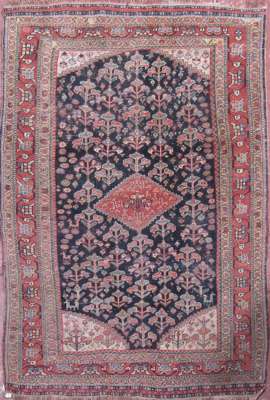 late 19th century, the indigo field with central rust lozenge medallion, ivory spandrels, within rust stylised palmette and scrolling vine border between ochre bands