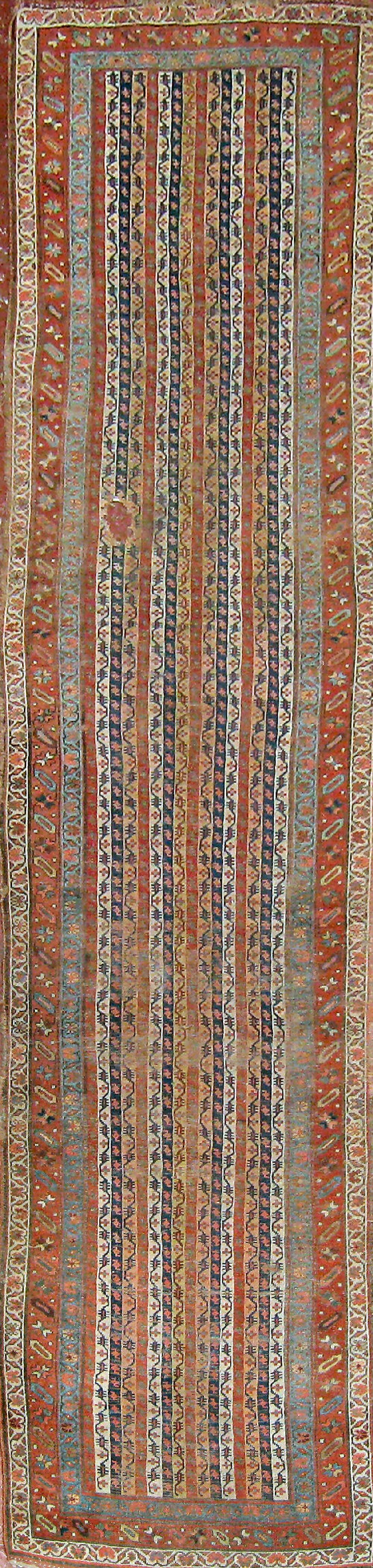 late 19th century, the field with allover polychrome vertical stripes pattern, within red stylised rosette and diagonal vine border between blue and ivory bands