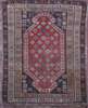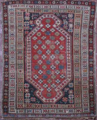 late 19th/early 20th century, the red double ended mihrab with allover rosette pattern, indigo spandrels, within lemon and ivory geometric borders, outer brown band