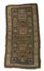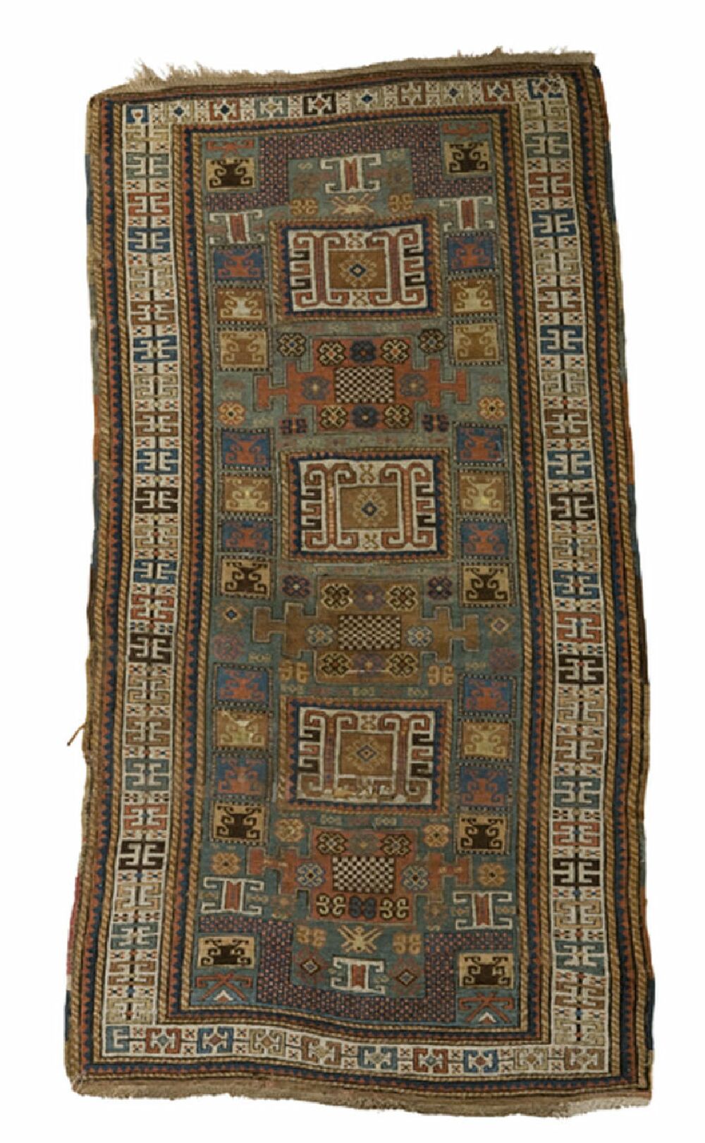 late 19th century, the green field with ivory square and red and brown shaped medallions, mihrab style end bars, within ivory double C and stylised vine border between pyramid bands