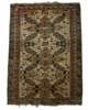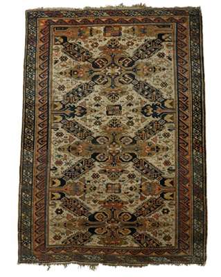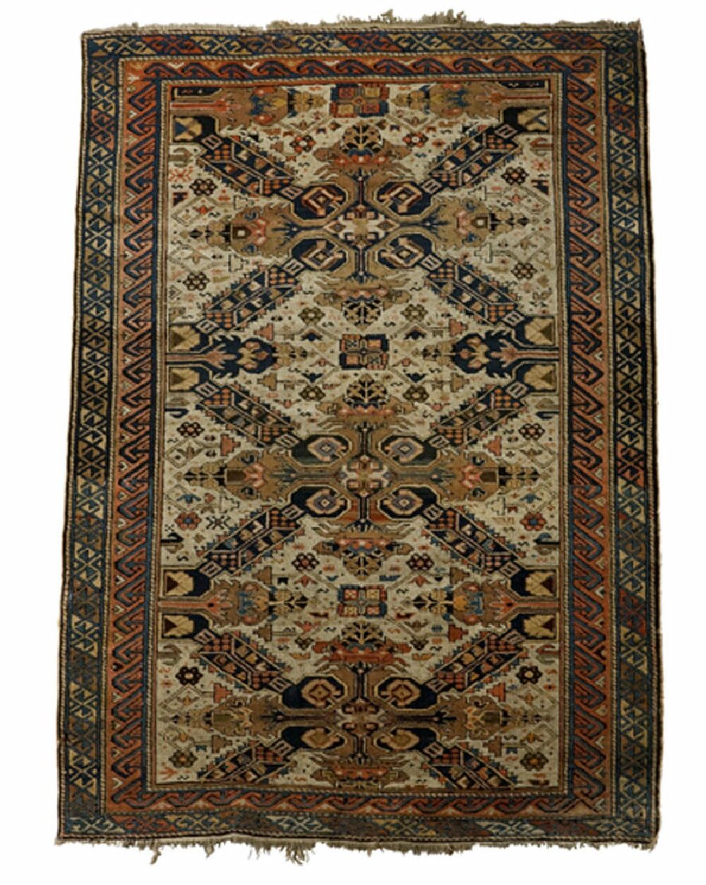 late 19th/early 20th century, the ivory field with three indigo and brown X medallions, within red wave scroll and blue hooked X borders