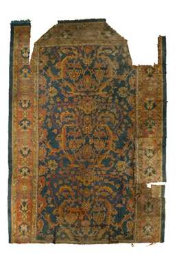 late 19th century, the blue field with allover red and orange palmette and serrated leafy vine pattern, within red palmette and rosette border between orange bands (cut to fit a room, losses and various loose pieces)
