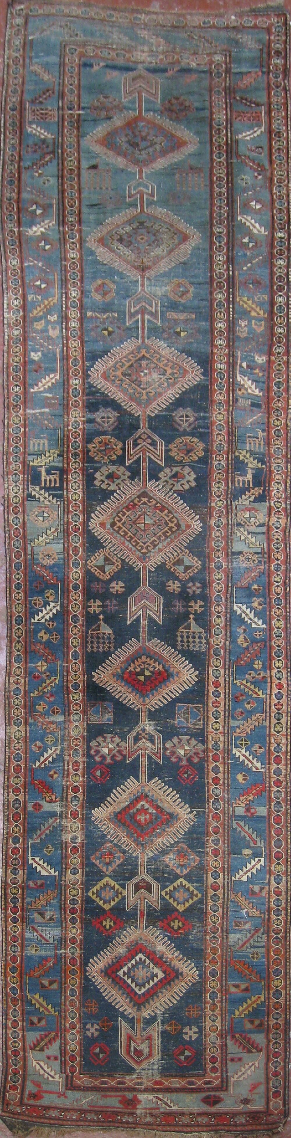 late 19th/early 20th century, the abrash indigo field with seven polychrome joined serrated lozenge medallions, within indigo serrated leafy vine border between brown bands