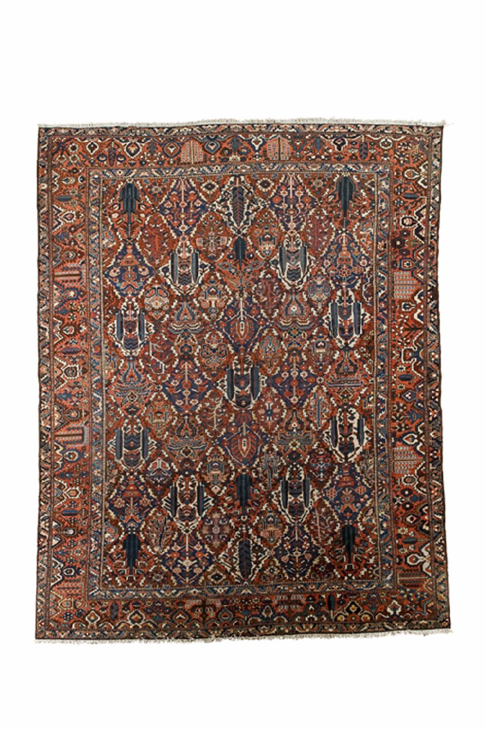late 20th century, the field with allover polychrome tree and foliate lattice, within red tree and foliate border between indigo bands