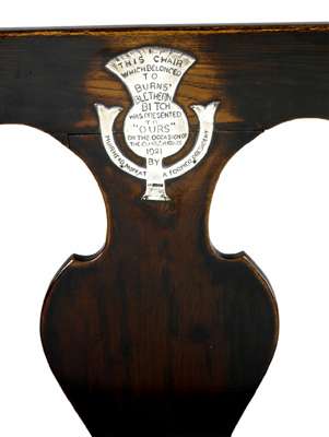 Muirhead Moffat was Glasgow's best known antiques dealer with palatial premises at 134 and 138 Douglas Street, and latterly at 134 Blythswood Street. It came into his possession originally when he exchanged the chair with the fine art dealer Craibe Angus & Son, of 81 Renfield Street, who was famous, along with Alexander Reid, for selling Impressionist paintings at the beginning of the 20th century. He was also an authority on Burns.