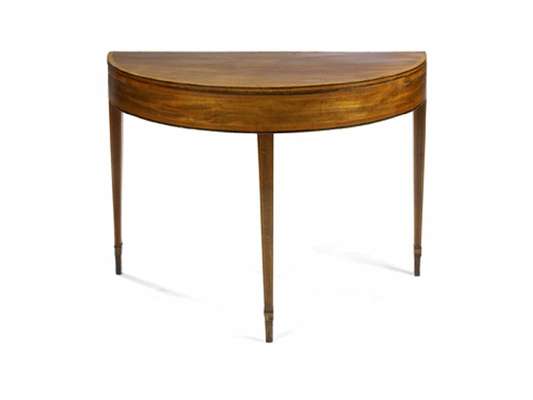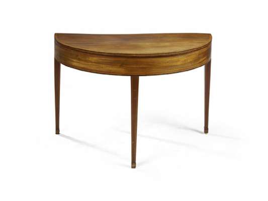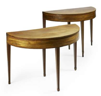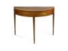 inlaid with stringing and rosewood banding, the demi-lune foldover tops on square tapered legs, rear central legs sliding out to reveal drawers to support each top (legs reduced on one table) (2)