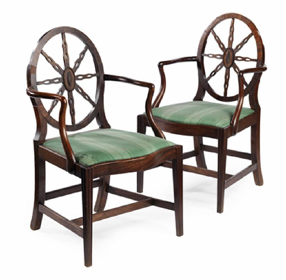 the oval backs with central beaded oval panels and pierced radiating arms above downsept open arms, the serpentine green fabric drop-in seats on fluted tapered legs joined by H-stretchers (2)