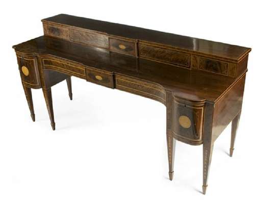 later inlaid with plain and chequer stringing and flowerhead ovals and roundels, the breakfront superstructure with a central outset panel flanked by a pair of sliding doors modelled as drawers, the lower section with three central drawers flanked by a pair of deep cellarette drawers, on square tapered husk inlaid legs ending in spade feet