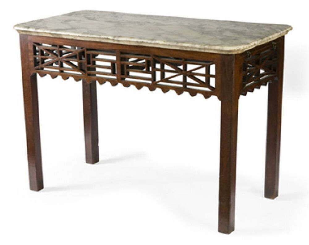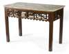 the mottled white marble moulded top with rounded corners above lateral sides, the front and side aprons of pierced trellis form in the Chinese taste, on square moulded legs