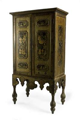 the projecting cornice above a pair of panelled cupboard doors enclosing ogee carved arches above open shelves and an arrangement of five shelves, the sides with brass carrying handles, the stand with shaped pendant-carved aprons, on bulbous turned legs