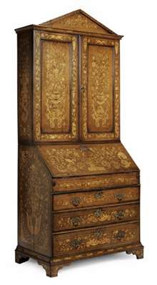 inlaid throughout with flowering vases, birds and scrolling foliage, the triangular pediment above a pair of panel doors enclosing adjustable shelves and three small drawers, rear of doors conforming with inlay, the fall front revealing a well and a stepped interior with central cupboard door and small drawers and pigeonholes, above three long graduated drawers and shaped bracket feet
