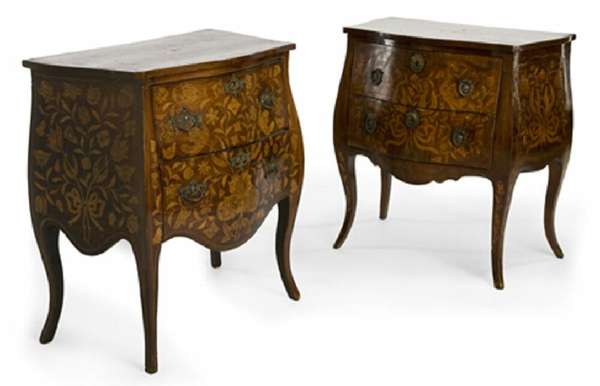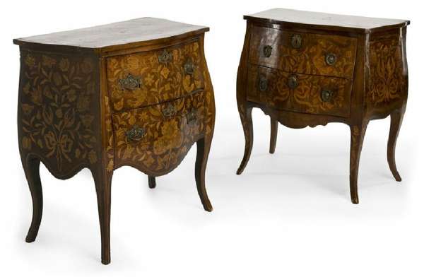 of small proportions, each of serpentine bombe outline with two drawers inlaid sans travers with floral scrolls, tulips and summer flowers, one slightly larger and inlaid with box and ebony lines, both on slender tapering cabriole legs (2)