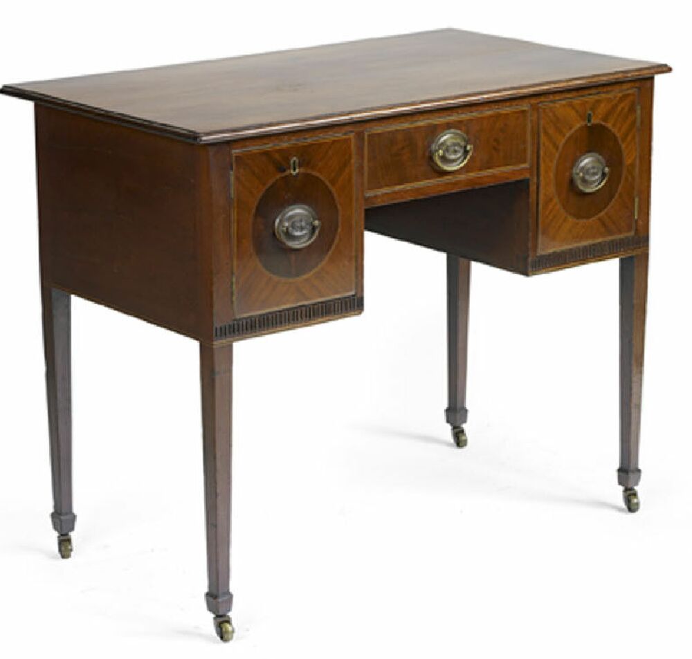 of small proportions, the rectangular top with moulded edge above a kneehole bounded by a frieze drawer and two cupboards and a stop-fluted apron rail, on square tapering legs ending in spade feet and castors, the whole inlaid with box and ebony lines