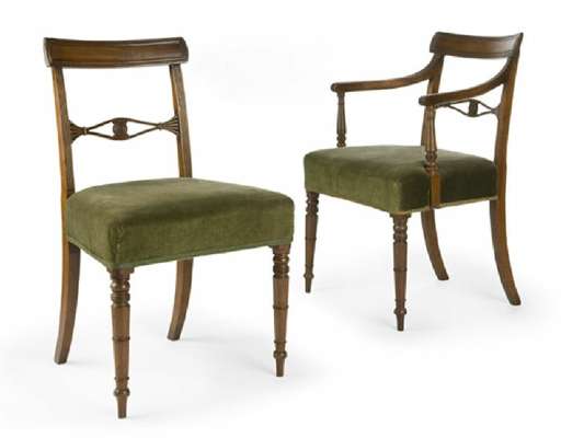including two armchairs, the moulded bar backs with reeded uprights above reeded roudel centred splats and stuffover seats, on ring-turned tapering legs (10)