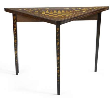 the triangular top decorated with chequered squares and gaming items, the baize lined interior with playing cards to each corner, on gate action square section legs inlaid with trailing foliage