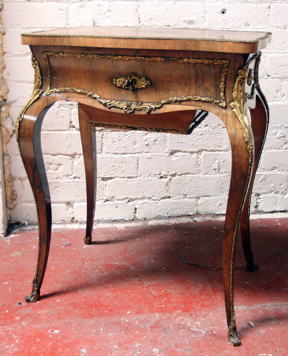 with ornate leaf scroll mounts throughout, the cartouche inset hinged lid revealing an interior with a removable divided tray and mirror to the inside of the lid, above a sliding work box, on cabriole legs ending in scroll sabots