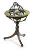 comprising a set of graduated rings representing circles on the celestial sphere, the meridian, equator, ecliptic horizon, tropics, and colures, the printed horizon with months and the signs of the zodiac, on an associated early 19th century stand with baluster column and inlaid splayed tripod base ending in brass paw caps and castors (adapted)