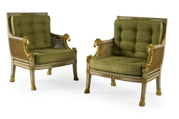 the rectangular framed backs carved with anthemia above downswept arms in the form of cornucopaie ending in ram's mask terminals, the bowed seats centred with foliate motifs, on sabre legs with rosette capitals ending in hairy paw carved feet (2)