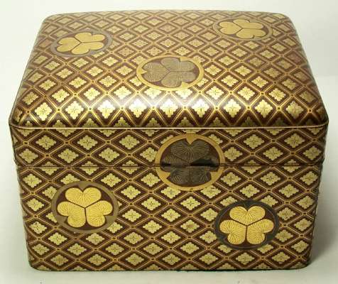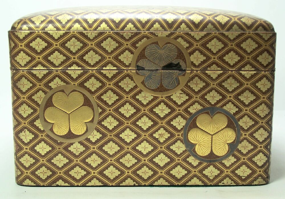 the sides and cover decorated in gold hiramaki-e and nashiji with geometric stylised foliate motifs, opening to reveal a void interior with removable tray