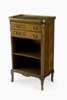 with gilt metal mounts, the three quarter galleried mottled marble top above two drawers and two open recesses, on short cabriole legs with scroll mounted feet