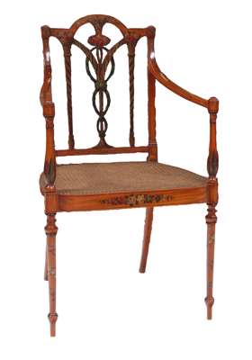 the arched back and downswept arms with floral painted decoration above a cane seat with squab cushion, on slender turned tapering legs