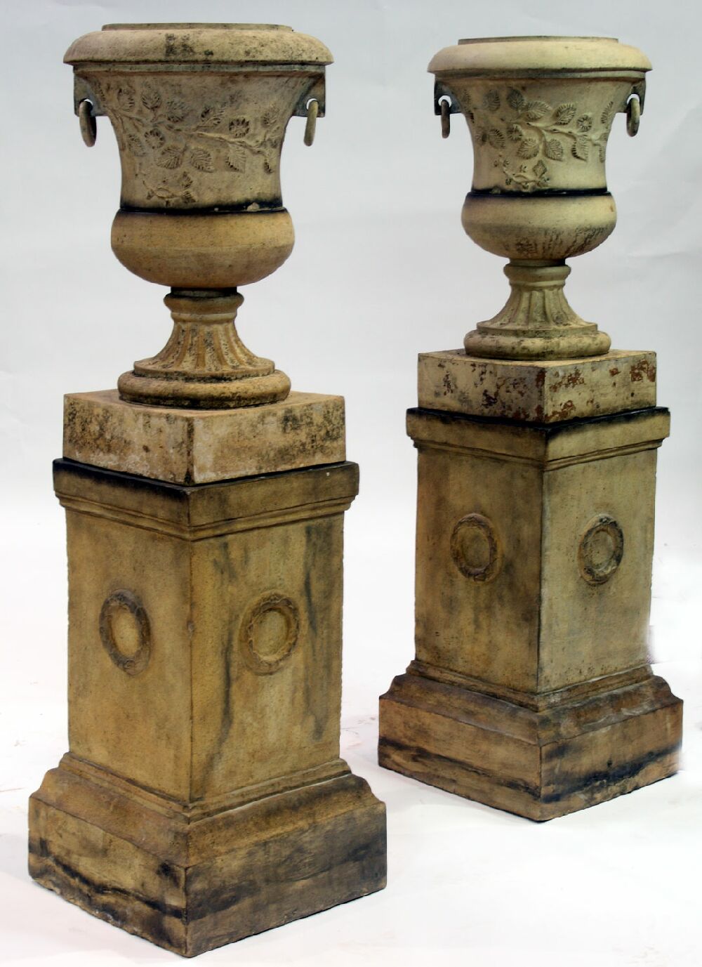 of campana form, the friezes moulded with incised sprays of foliage, with fixed ring handles, on fluted socles and square pedestals decorated with wreaths to each face, on plinth bases, impressed marks 'HURLFORD FIRECLAY WORKS, KILMARNOCK' (2)