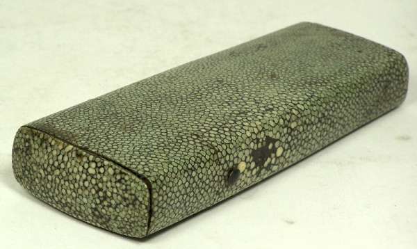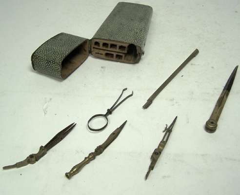 of tapered hand held form, the hinged lid revealing an interior with divisions, now with six brass instruments