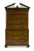 the broken arched triangular pediment carved with rocaille, open trelliswork and blind fretwork around a dentil frieze, above two short and six long graduated drawers, with rocaille cast handles, divided by a central brushing slide and flanked by blind fret carved canted upper angles, on a gadrooned apron with distinctive relief carved inscrolling ogee bracket feet