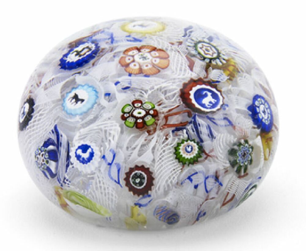 set with brightly coloured millefiori canes, inset with silhouettes including a horse, monkey, butterfly, cockerel, squirrel, goat and dog, with date canes 'B1848'