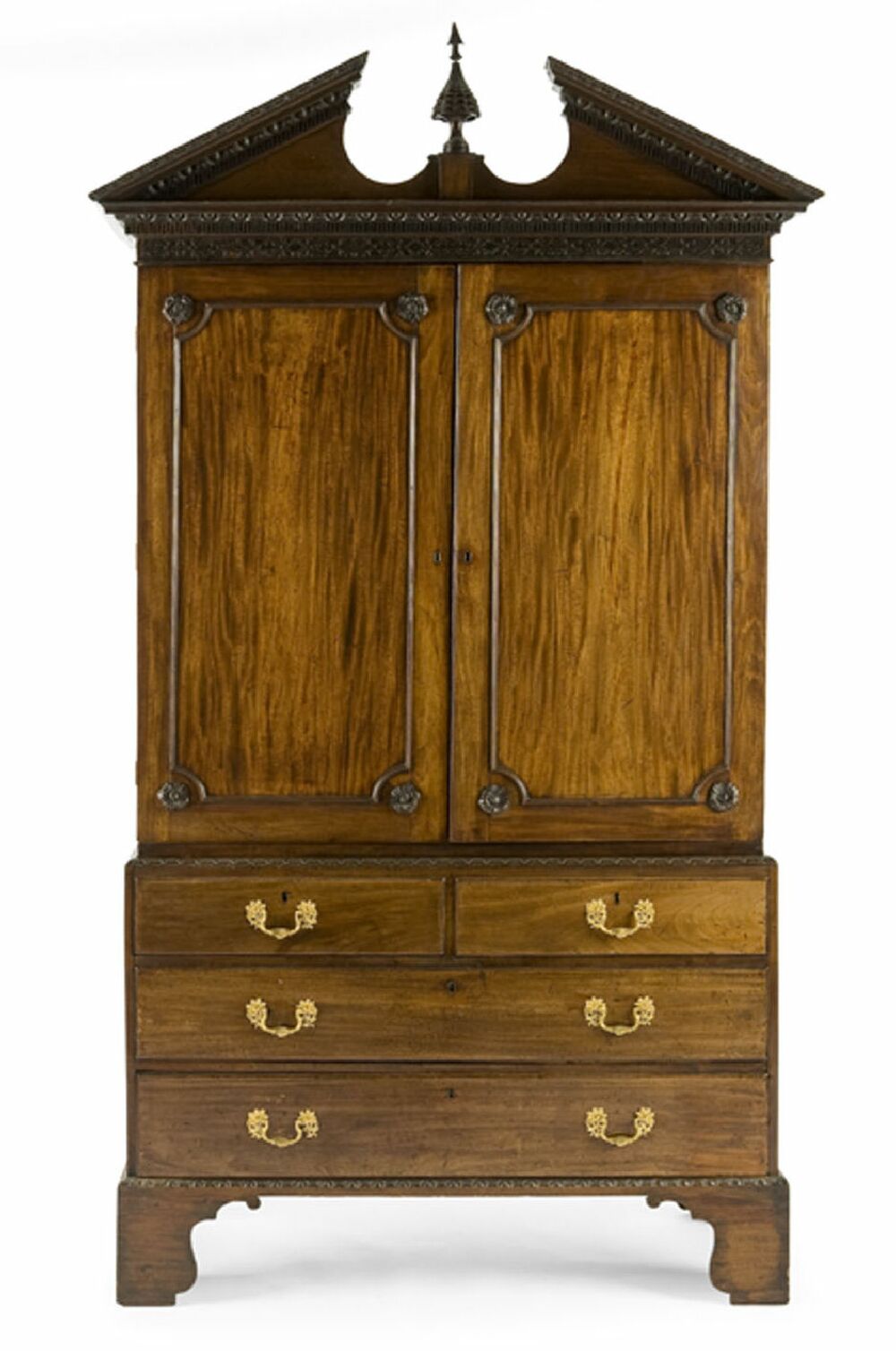 the broken triangular pediment with egg and dart, rocaille and key fret mouldings flanking a central pine cone finial above a blind fret carved frieze, the two rosette carved panel doors enclosing hanging space, the lower section with leaf carved edge and two simulated short drawers above two long caddy moulded drawers with brass drop handles, on carved apron and scroll carved bracket feet