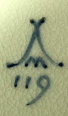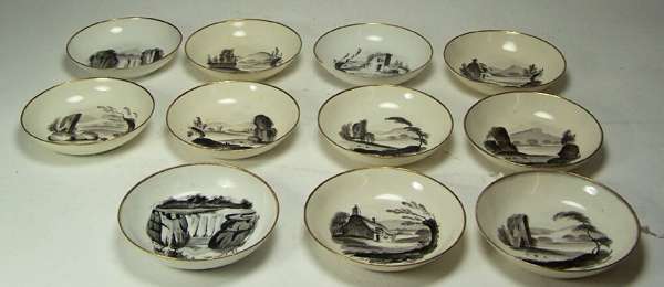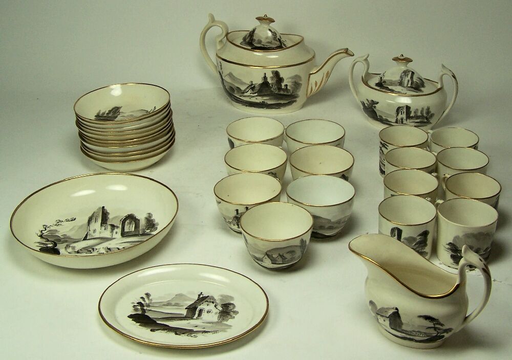 painted in black with ruins within a landscape setting, with gilt borders, comprising: a teapot, cover and stand; a twin handled sugar bowl and cover; a milk jug; a bread plate; six tea cups; six coffee cans; and eleven saucers, blue painted mark and pattern number 119 (28)