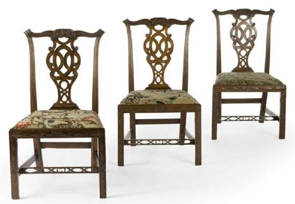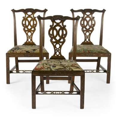 the reeded yolk-shaped top rails decorated with husks and a rocaille cartouche enclosing a bell motif, the entrelac splats above floral gros point needlework drop in seats with caddy moulded and blind 'guilloche fret' carved rails, on chamfered square section legs united by pierced H-stretchers (3)