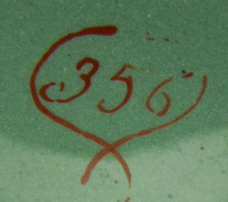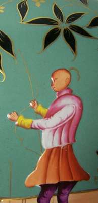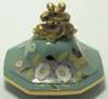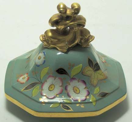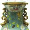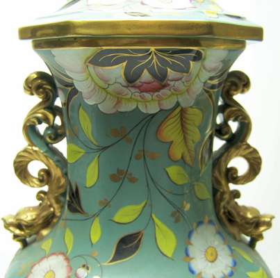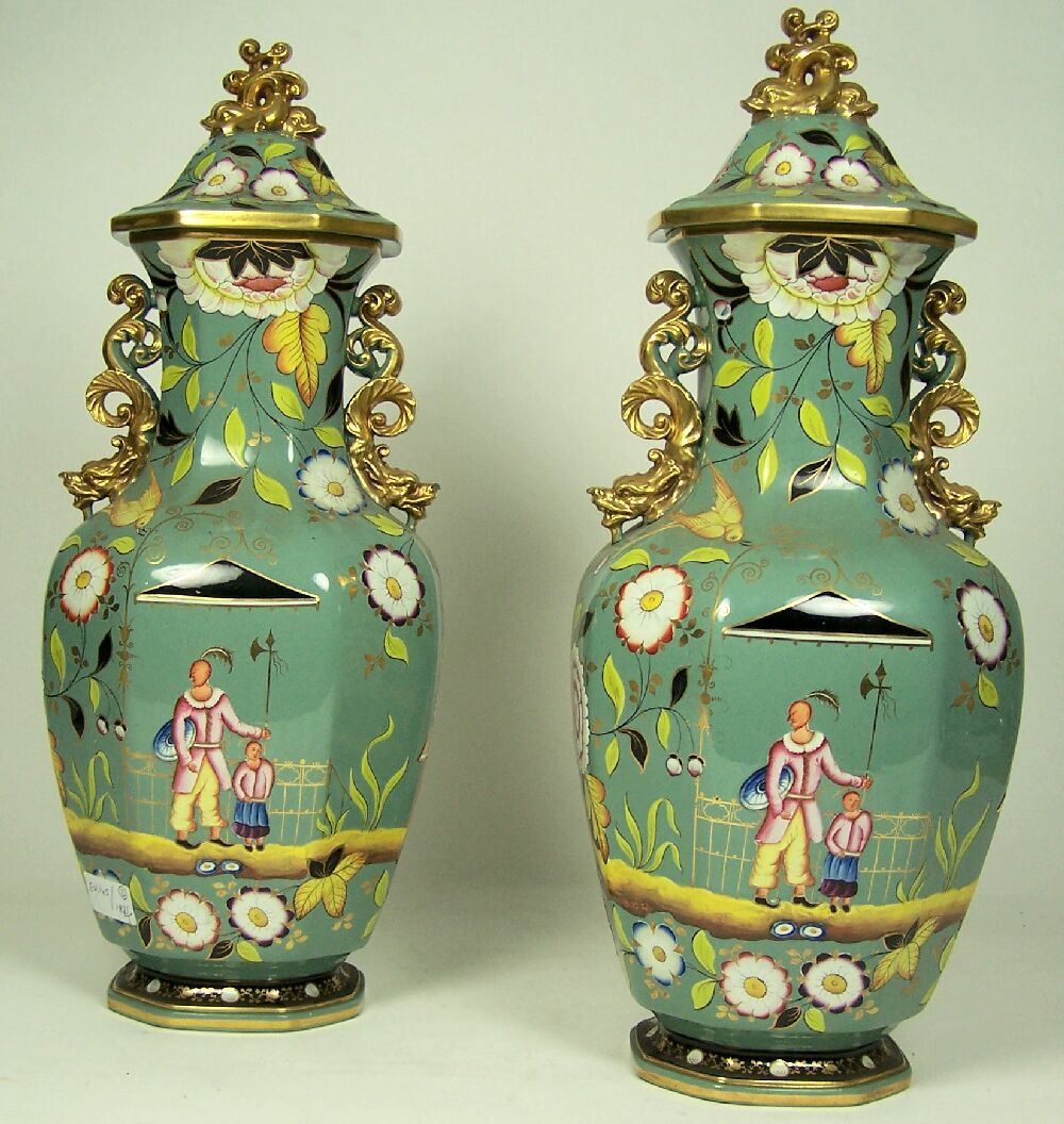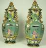 each of octagonal baluster form, the finial and handles of gilt dolphin form, decorated with figures and stylised flowerheads on a teal ground, red painted mark (2)