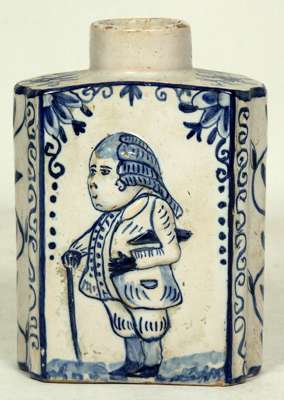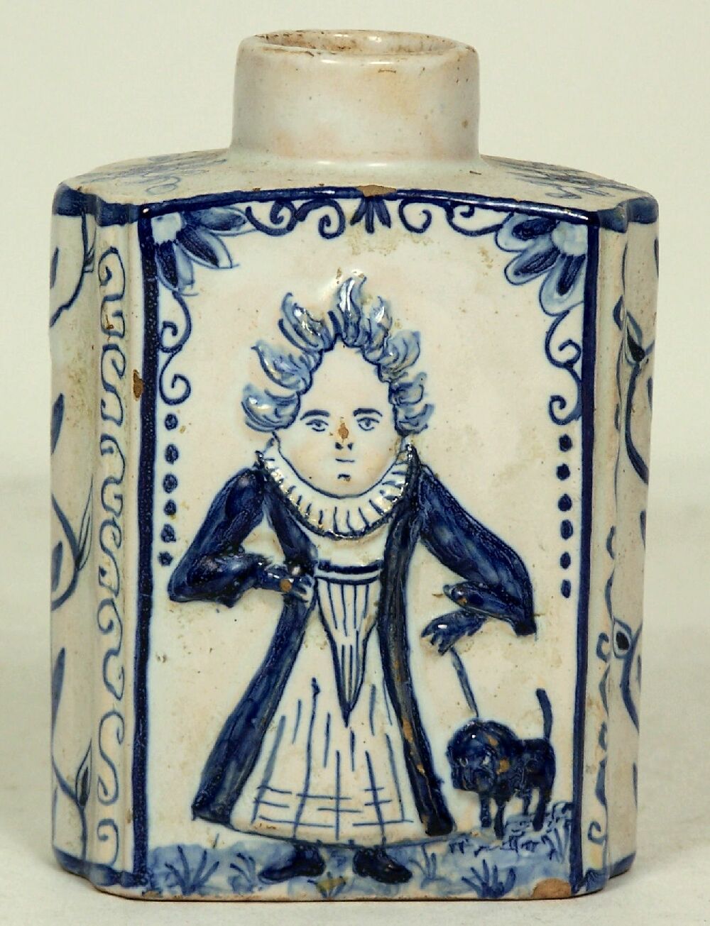 of rectangular form with scrolled sides, with opposed panels of a lady and a dog, and a man, the rest decorated with scrolling flowers and foliage