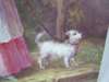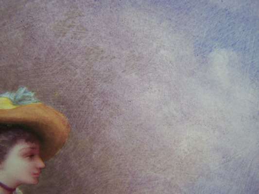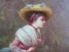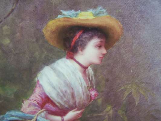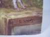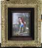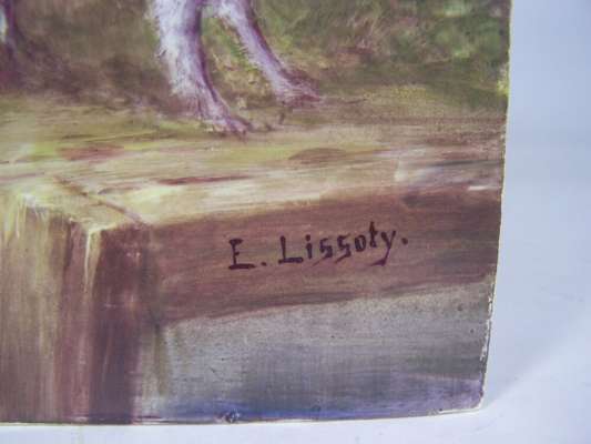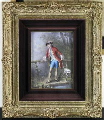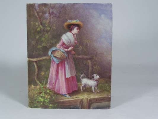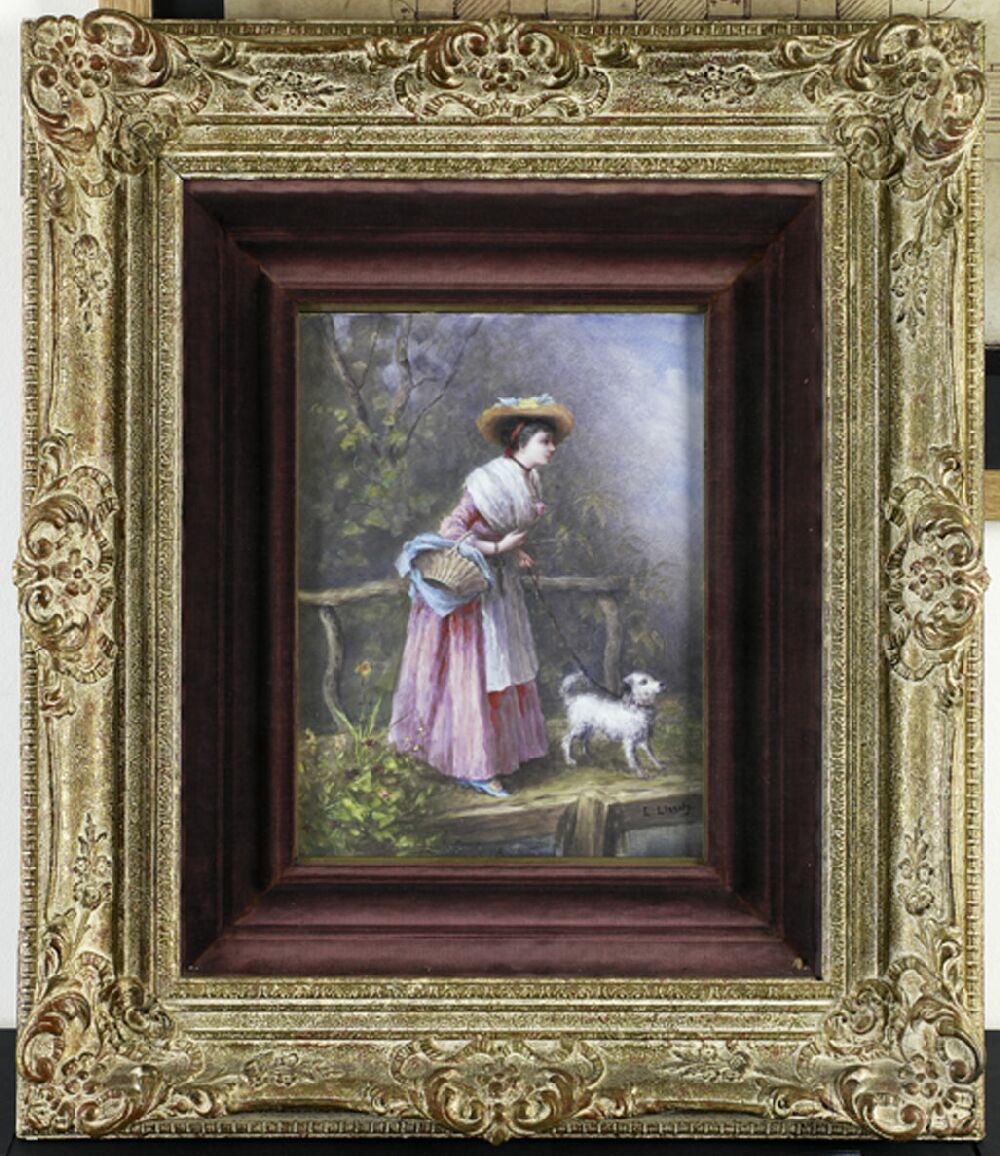 of rectangular form, one painted with a lady and her dog, dressed in a hat and pink dress, standing on a bridge, the other of a man holding a gun and with his dog, standing on the same bridge, in a wooded landscape, both signed E Lissoty, unmarked to reverse, in gilt gesso foliate carved frame, glazed (2)