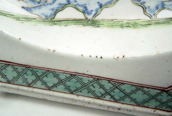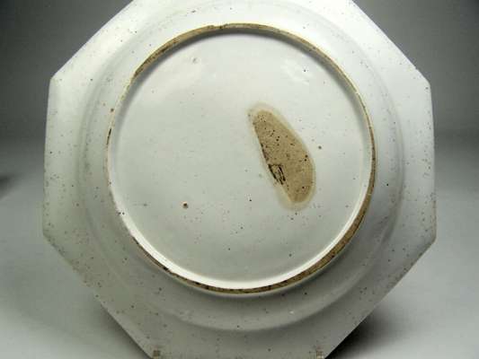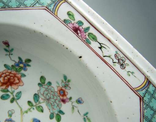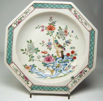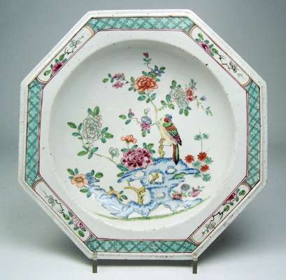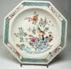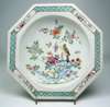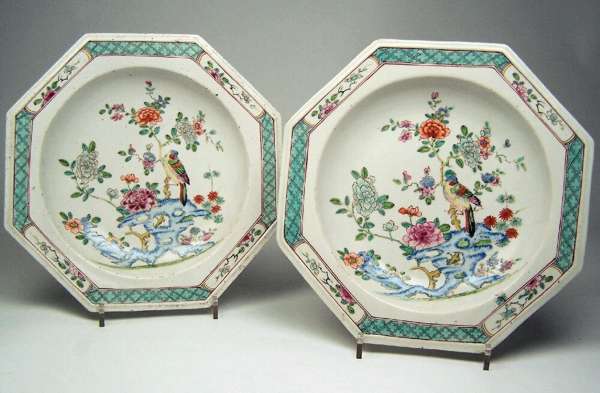of octagonal form, each polychrome painted in the Chinese style with an exotic bird amongst flowering foliage and rockwork, the trellis work border with narrow ovoid flower panels, unmarked (2)
