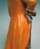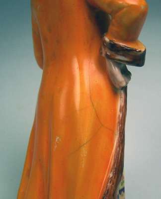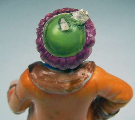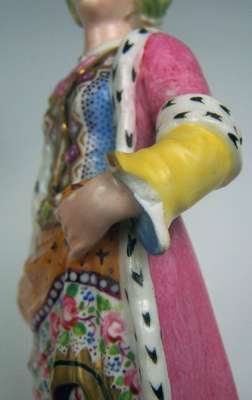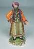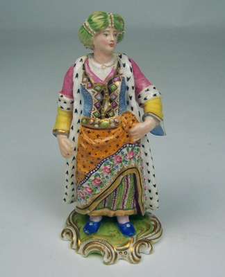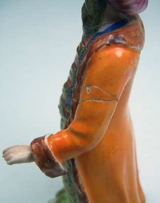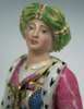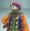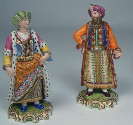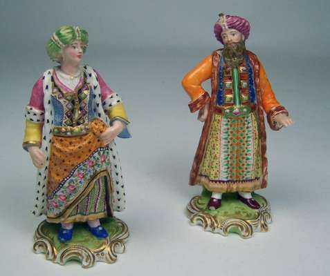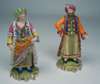 the man wearing a pink and green turban, orange coat and patterned waistcoat and robe, the woman in green and orange turban, wearing a pink coat with black and white trim, over a patterned dress, both on rococo scroll bases, unmarked (damages) (2)