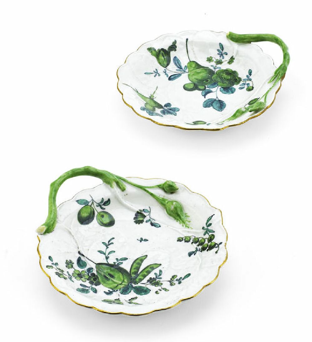 each of circular scalloped form with a branch form handle terminating in moulded flower buds, the well with moulded leaf decoration and painted in green with pears, plums, flowers and leaves (2)