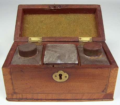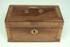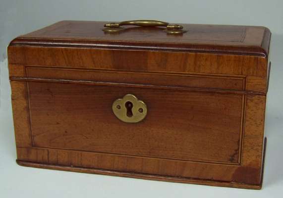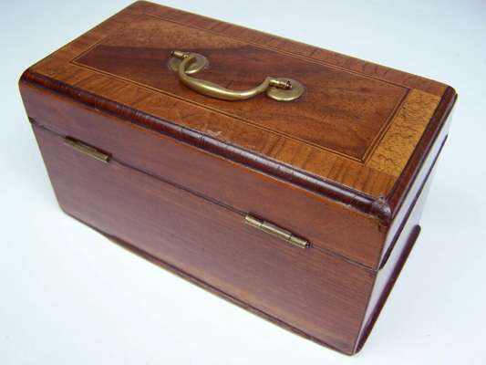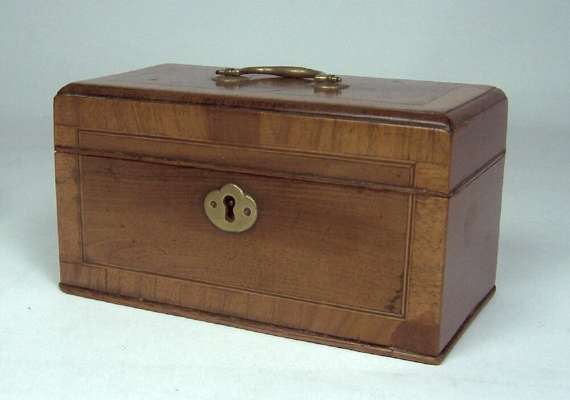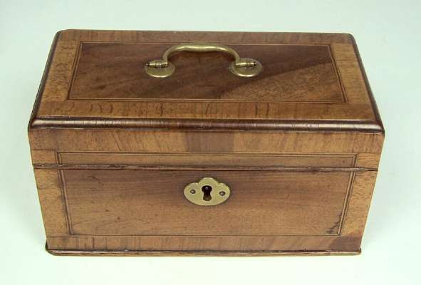 of oblong form, with cross-banding and stringing, brass bail handle and cartouche-shape escutcheon, the interior with three galvanized tin containers
