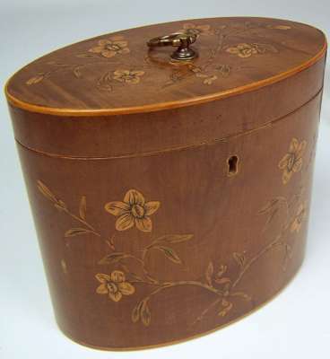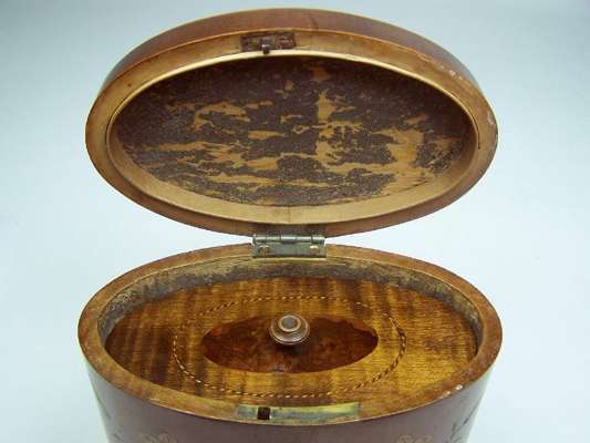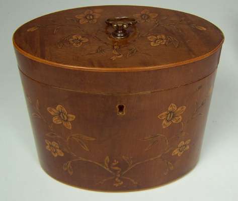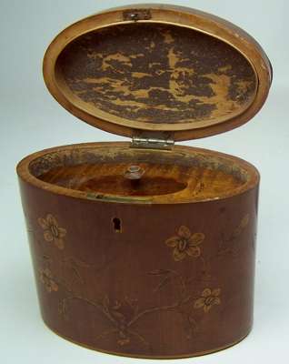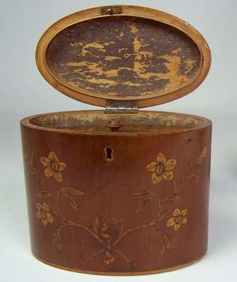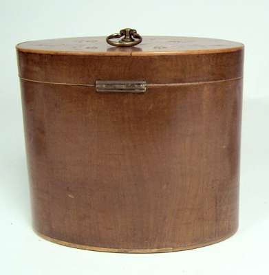 of oval straight sided form, the lid and front decorated with flowers and foliage with ribbon ties, interior with inlaid cover
