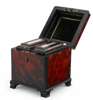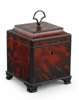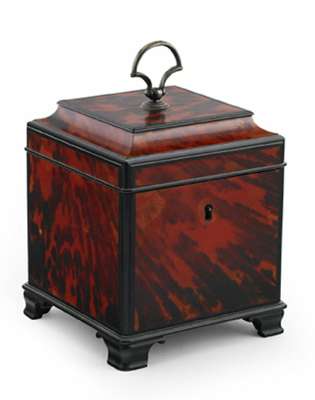 of cube form with a sarcophagus lid, white metal handle the two section interior each with a sarcophagus lid, on ogee bracket feet