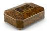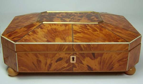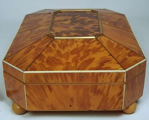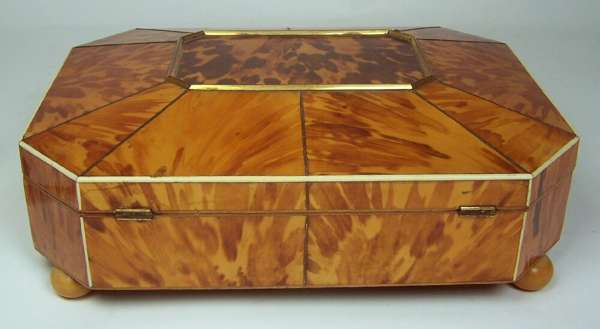 of oblong form with canted corners, the sarcophagus lid with gilt metal beading, ivory outlines with white metal divisions, the well fitted interior with compartments, part silk lining