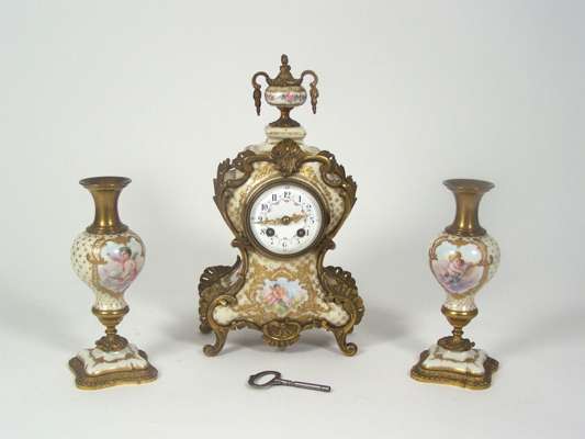 A 19th century porcelain and gilt bronze mounted clock garniture In the Louis XV style