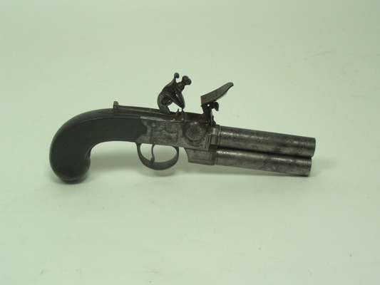 A mid 18th century flintlock boxlock double barrelled tap action pocket pistol