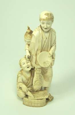 A Japanese ivory okimono of two fisherman, Meiji period Signed Saul Mitsu