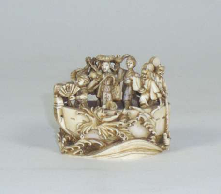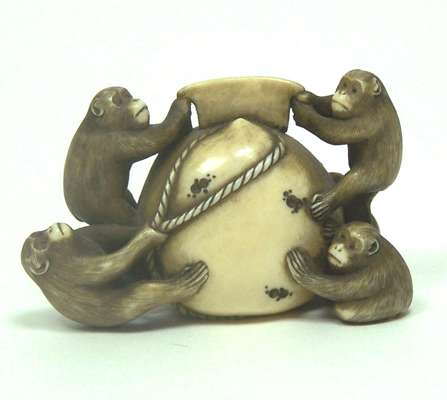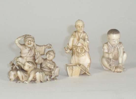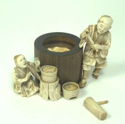 A Japanese ivory and wood okimono of laundry workers, Meiji period