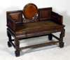 the panelled back with open fretwork and central medallion, over panelled enclosed arms reeded seat, raised on angular cabriole legs united by stretchers