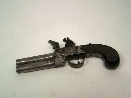 A mid 18th century flintlock boxlock double barrelled tap action pocket pistol