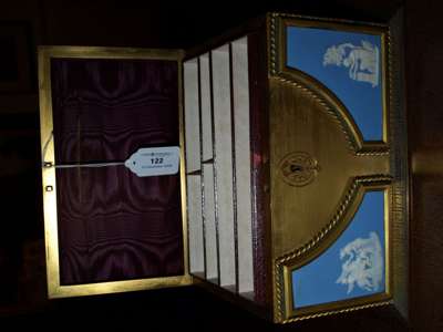 retailed by Asprey & Son, London, the hinged cover, sides and handles inset with classical plaques opening to reveal a line compartmented interior, the outset plinth base with Greek key decoration, the lock inscribed 'C Asprey & Son, 156 Bond St.'