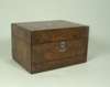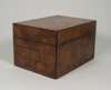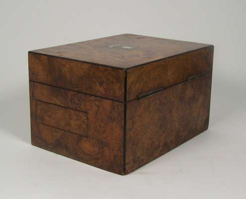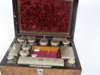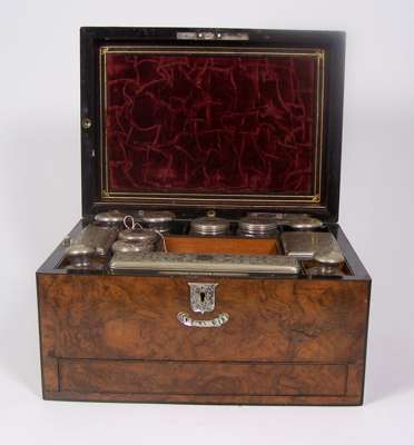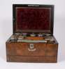 the hinged lid centred by a mother of pearl cartouche, opening to reveal a compartmented fitted interior with silver plated lidded glass jars and bottles, the side and apron each with a spring action drawer